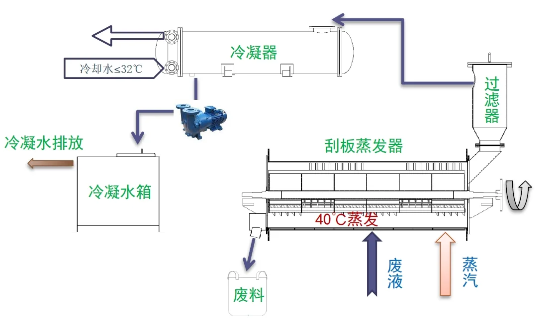 ?約40℃低溫真空干燥,利用蒸汽作為熱能將廢液中水與廢物分離,蒸餾水冷凝外排,COD可降低99%,實現達標排外或中水回用。